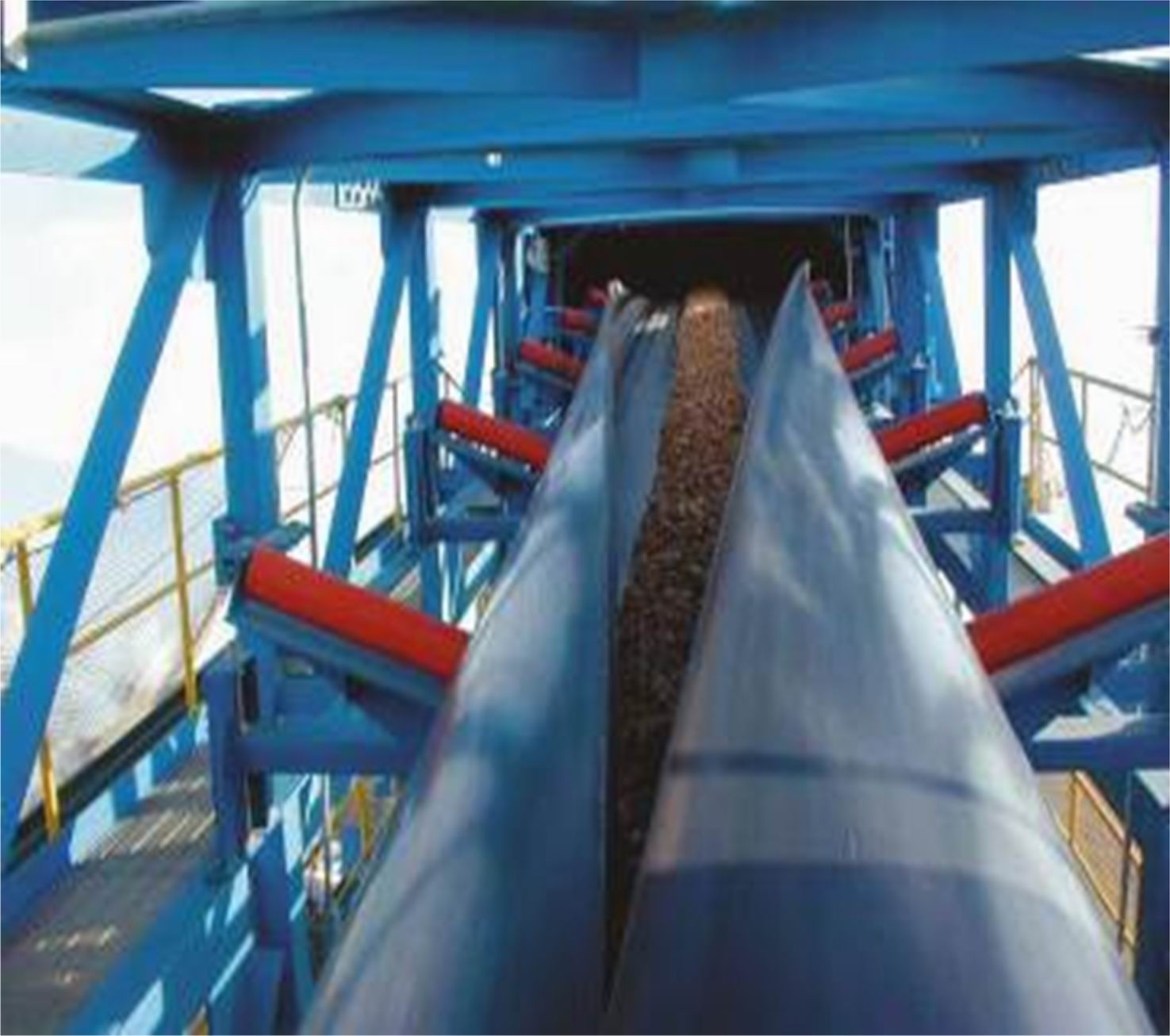 中国第一条转弯难度堪称世界之最的钢丝绳芯管式输送带。该带带强ST2500,管径350mm,长度14300米,服务于尧柏特种水泥公司的原料输送。